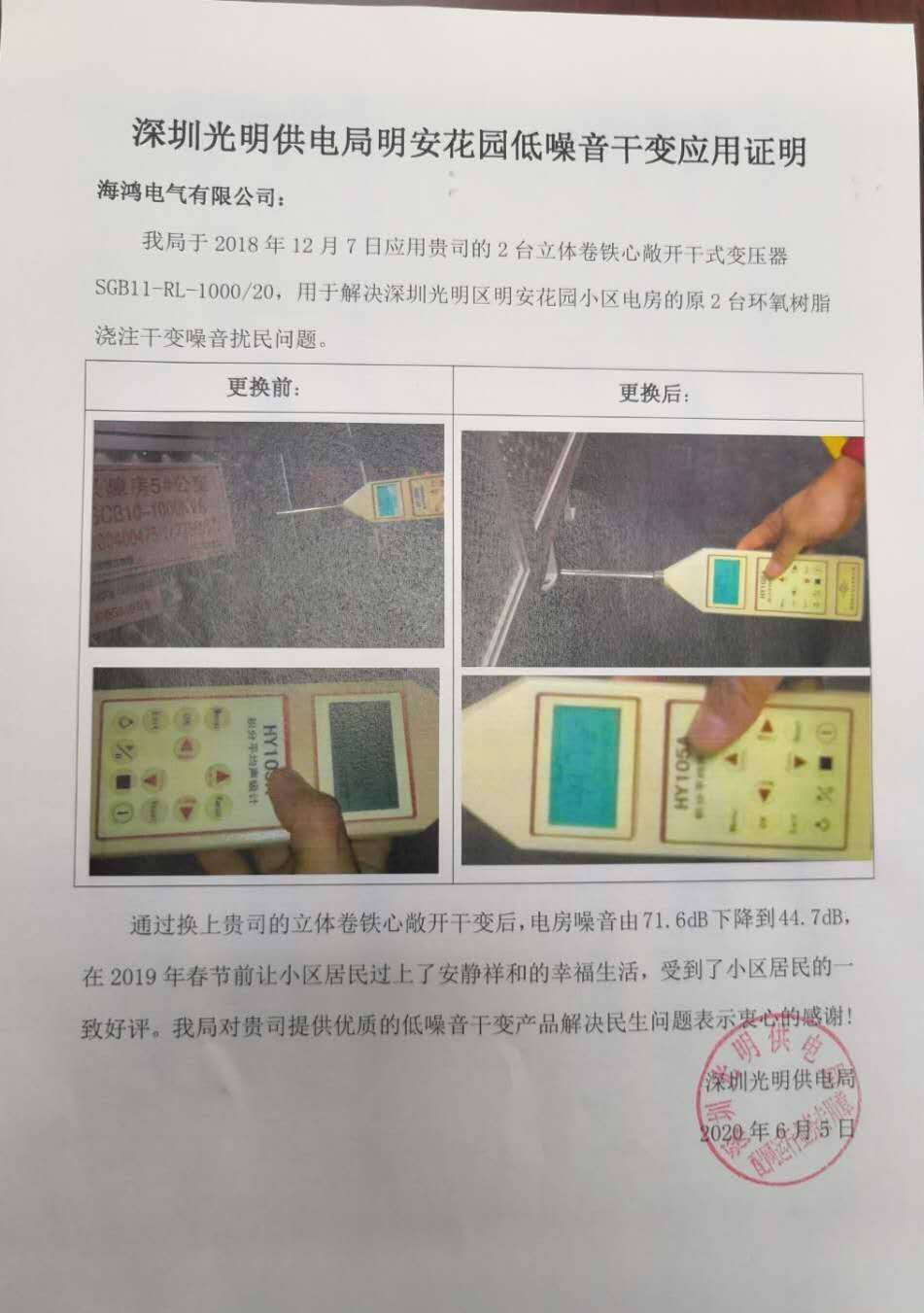 2018年12月7日深圳市光明区明安花园因小区电房原2台环氧树脂浇注干变噪音扰民,而更换海鸿电气两台SGB11-RL-1000/20敞开式立体卷铁心干式变压器。海鸿电气产品安全可靠、宁静运行的优势让明安花园重获安静祥和,并得到小区居民与深圳光明供电局高度认可。