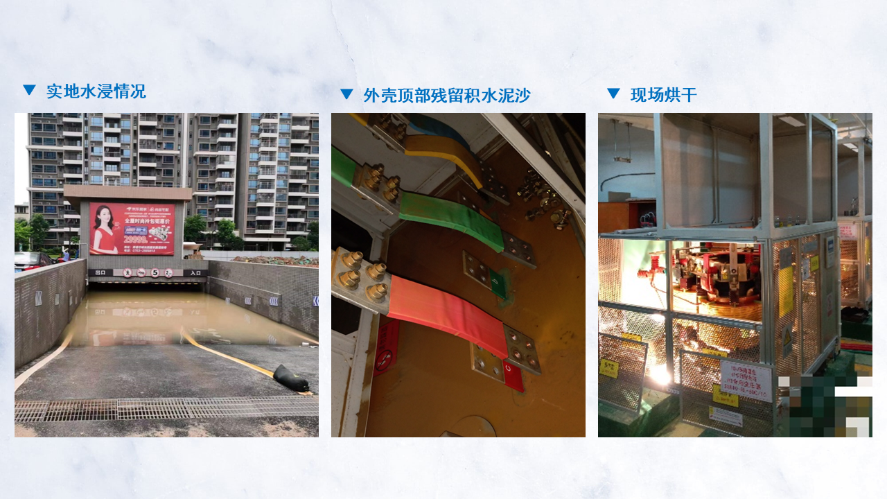 受持续性暴雨到大暴雨影响,某小区位于地下停车库的配电房被洪水淹没,5台敞开干变均被没顶浸泡三天三夜。经简单处理后,现场检测各项指标正常,可恢复正常供电,大大降低灾后维修成本,加快复电效率。