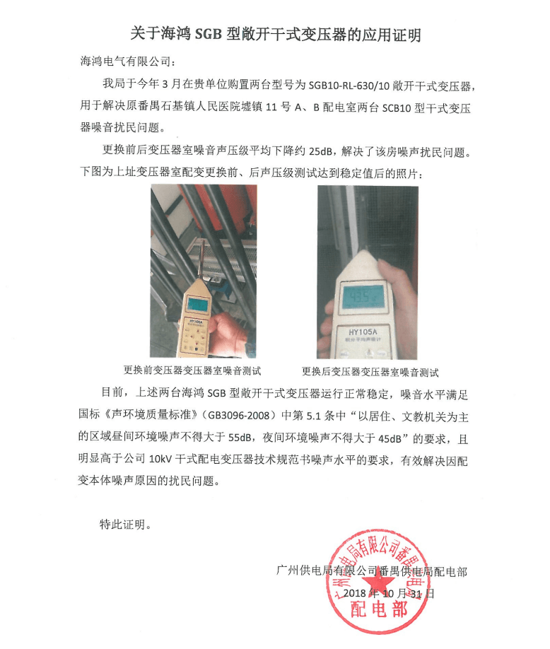 广州市番禺区石基人民医院是一家集医疗、保健、康复、健康教育、计划生育技术服务于一体的综合性“二级甲等”医院。医院原有变压器噪音太大,严重影响就医环境,影响医生工作、病人休息,后采用海鸿电气立体卷铁心变压器后,噪音由原来的77.5分贝下降到43.5分贝,杜绝噪音扰民的问题,且产品过载能力强、抗短路能力强满足医院高负荷用电需求。